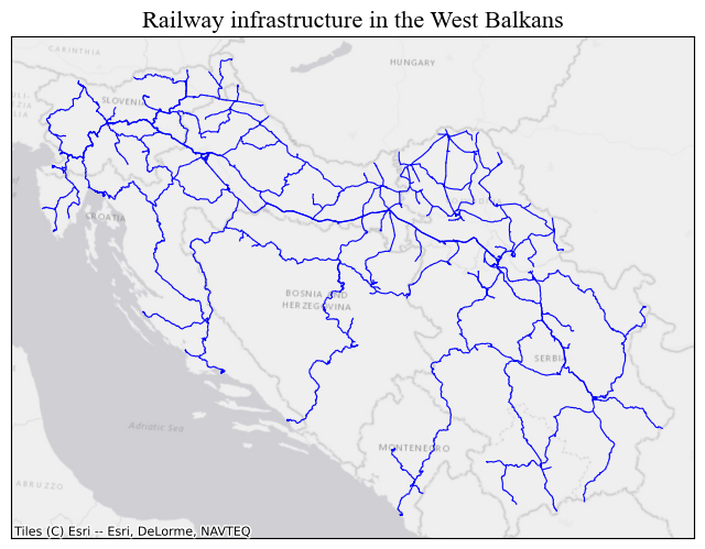 ax.set_title("Railway infrastructure in the West Balkans", **title_parameters) #parameters as aboveText(0.5, 1.0, 'Railway infrastructure in the West Balkans')