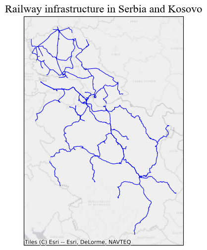ax.set_title("Railway infrastructure in Serbia and Kosovo", **title_parameters) #parameters as aboveText(0.5, 1.0, 'Railway infrastructure in Serbia and Kosovo')