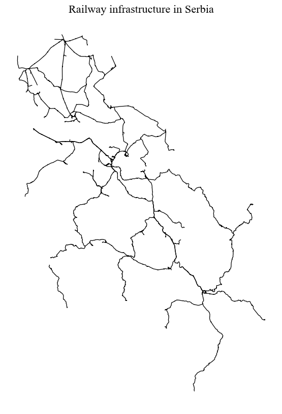 ax.set_title("Railway infrastructure in Serbia", **title_parameters) #parameters as aboveText(0.5, 1.0, 'Railway infrastructure in Serbia')