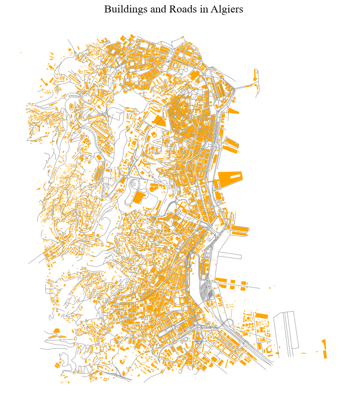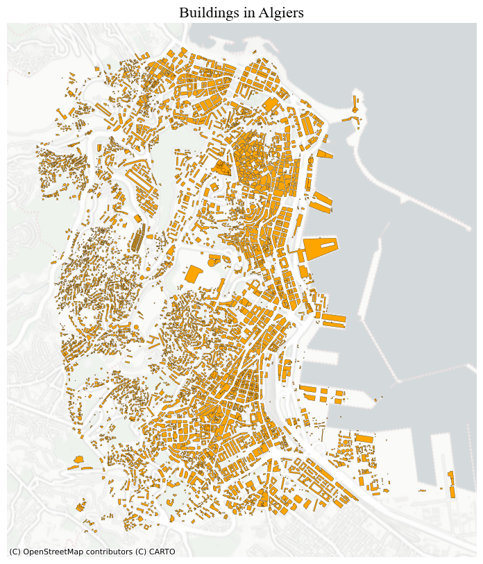 We are again using OSMNX to download data from OpenStreetMap automatically. In this case, we will get building footprints from the city of Algiers in Alageria.