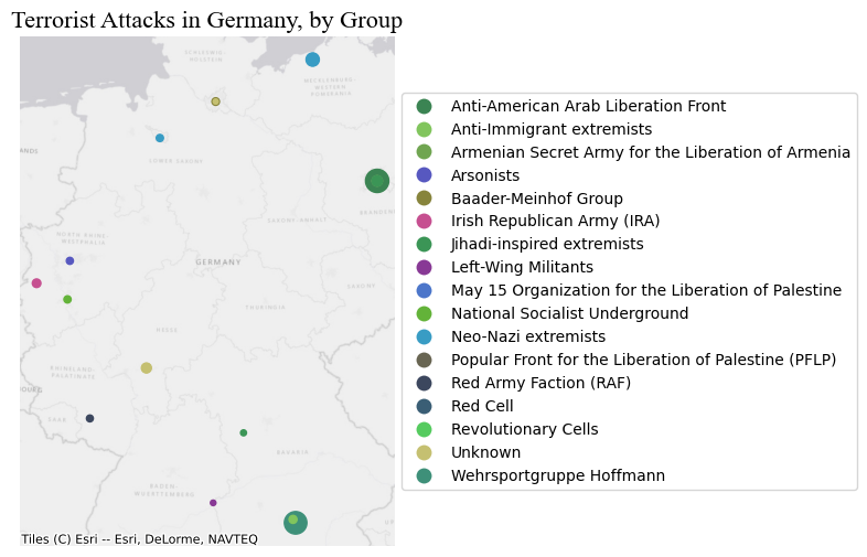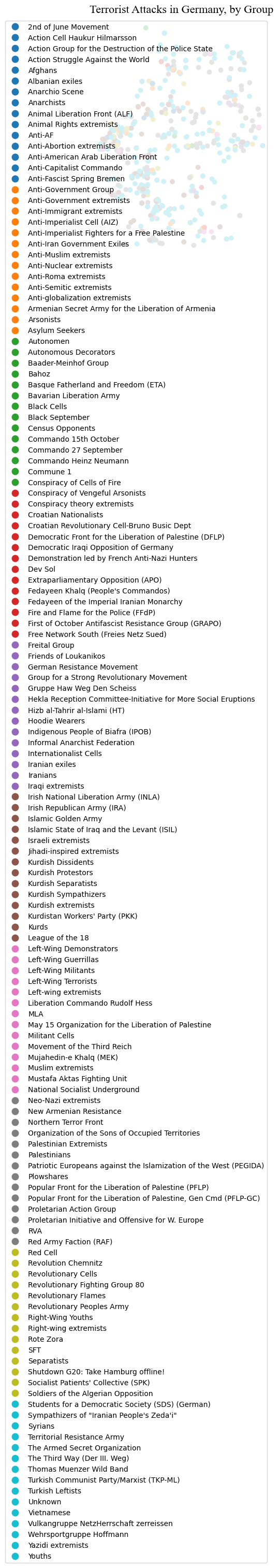 ax.set_title("Terrorist Attacks in Germany, by Group", **title_parameters) #parameters as above