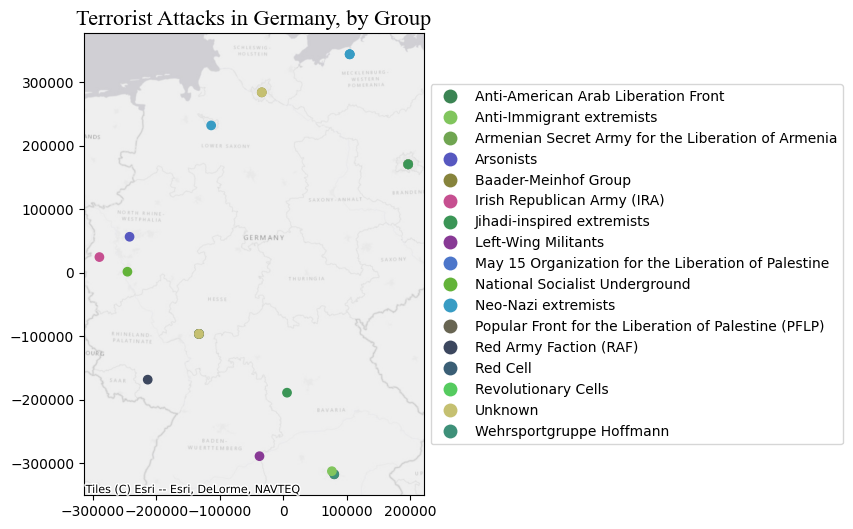 A choropleth for categorical variables assigns a different color to every potential value in the series based on certain colormaps (cmap). We don’t need to specify a scheme in this case, but just to the categorical column. Using last’s week GeoDataFrame, we can plot terrorist attacks in Germany, for example, by group.